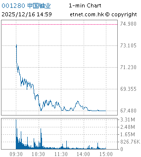 | 001280 | 中国铀业 | 67.550 | -7.430 | -9.909% | 38.91亿 | -- | ||